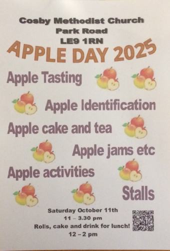 On Saturday we will be hosting an Apple Day at Cosby Methodist Church; a large collection of named apples plus some really unusual ones to taste; a display for Leicestershire Heritage Apples; illustrations of the principles of pruning and apple breeding (getting new varieties, choosing the parents and pollinating by hand); apple identification, single-variety apple jams and jellies, apple cakes and other things. We hope to see you there. Come and learn about apples. Times: 11am - 3.30pm. No admission fee; proceeds on sales go to the upkeep of the premises and to All We Can – Methodist Relief and Development charity.