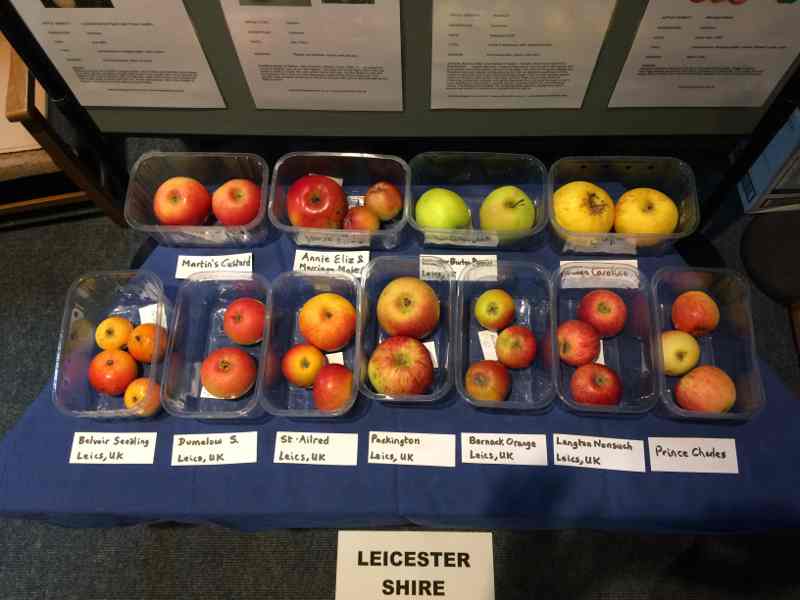 Sat 11 Oct: A highly successful Apple Day, organized by Alison and held in the church and church hall. 100 varieties of apple were on show, including all of the Leicester Apples except Sweetings (an early type fruiting in July and early August). There was apple tasting, apple identification, advice on tree management and pest control; we were also visited by eight of our previous grafting students, 3 of whom brought fruit from their trees. One student brought in a stunning red-orange Peasgood Nonsuch weighting about a pound and a half, and a bright orange 'Sunset' apple, from trees grafted on our course in 2018. Others brought photographs.