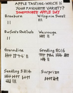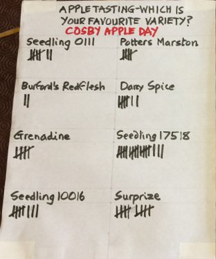 Please email if you would like to attend any of our grafting courses. Mel Wilson does courses in North Leicestershire; we hold an all-day (5 or 6 hour) session on the third Saturday in February in Cosby each year. The cost of the Cosby course is £50; date will be Sat 21 Feb; 9.30 for 10.00 in the Methodist Church Hall. (see link at the top for the complete list of what LHAP does). And for those of you who are curious about what you tasted - 86 of you took part - the results are shown below.