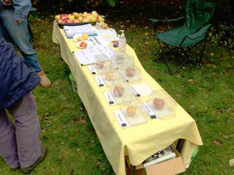 Sun 12 Oct: This was held outdoors, in the orchard. There has been a bumper crop of apples this year, and the site is obviously well looked after. Leicestershire Heritage Apples (Alison and me on this occasion) were given a prominent position on the top track; we were clearly visible to everyone as they entered the plot and we had a lot of interest from visitors. There were lots of other stalls though we were too busy conducting apple tastings (almost continuous from 11 am to 3 pm) to look at many of them. However I managed to buy some delicious cakes for lunch from the Donisthorpe Primary School stand and a couple of hot drinks from the people manning the barbeque, and we had some moderate-volume folk music which was loud enough to enjoy but not too loud to stop us talking to our visitors. I noticed some demijohns and bottles on two of the tables so I assume the cidermaking competition was in full swing.